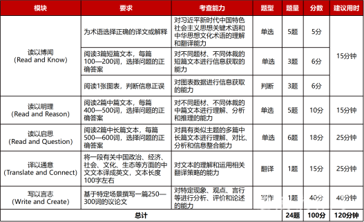 包括综合试卷及定题演讲两部分。综合试卷包括阅读客观题若干道、汉外笔译、写作,赛题由大赛组委会提供;定题演讲要求选手根据大赛组委会公布的定题演讲题目进行2分钟演讲。